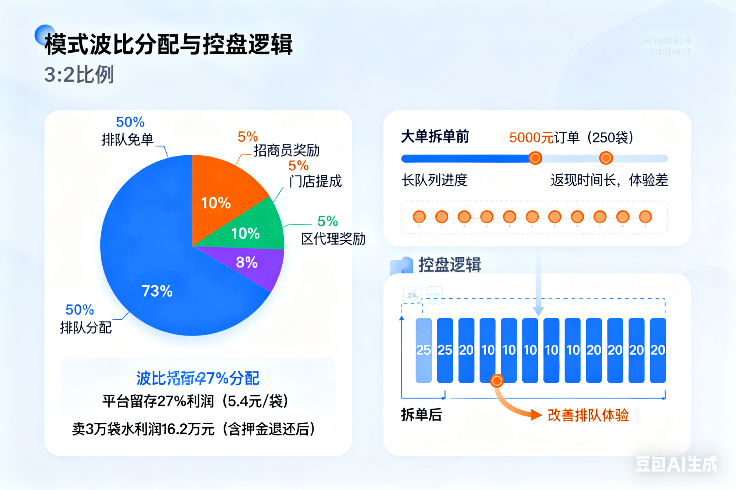 该模式的总波比分配为:50%用于排队免单,5%奖励招商员,门店拿 10%,区代理分 8%,总计 73%。由于水的成本低,设备接水龙头即可制水,平台每袋水仍有 27%的利润(5.4 元)。即便退还水机加盟押金,按卖 3 万袋水计算,平台利润达 16.2 万元,因此招商速度极快。