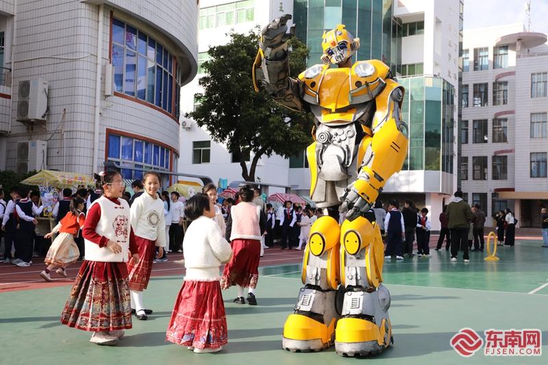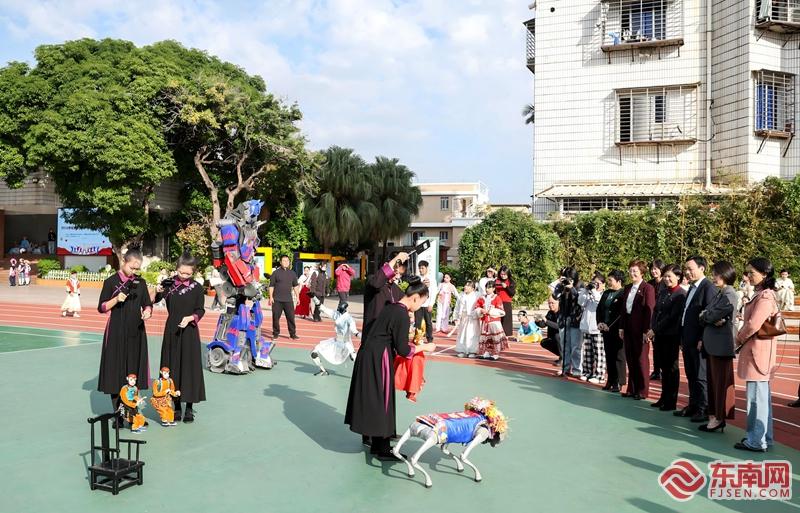 管弦乐演奏《佛罗伦萨进行曲》、闽南童谣《四海五洲好朋友,都爱来䞫咱泉州》、情景童谣表演《府文庙 拜孔子》……随后的学校少年宫特色项目展演活动,7所学校学生在舞台上展示平日所学。